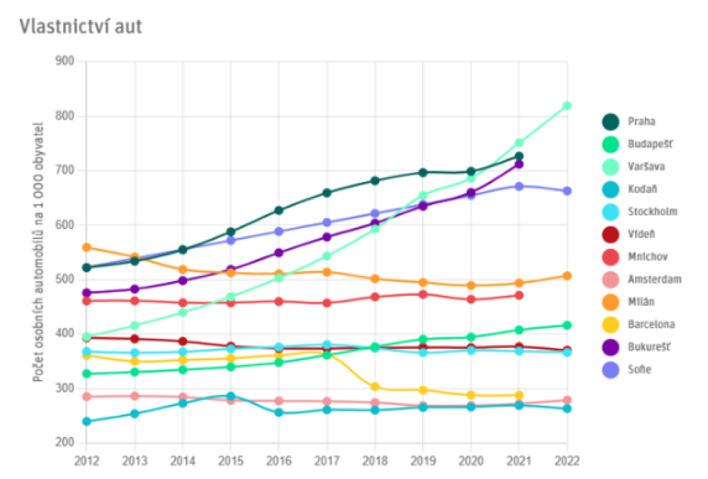Graf níže z dílny IPR Praha (viz https://app.iprpraha.cz/apl/app/praha-v-evropskem-kontextu/dojizdeniníže) zachycuje trend uplynulých let, kdy v městech zemí střední a východní Evropy – tedy v zemích bývalého východního bloku – přibývá aut v přepočtu na obyvatele tak výrazně, že už zřetelně předčí západní města, která druhdy dominovala.