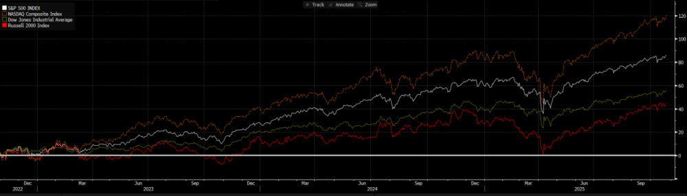 graf - srovnání výkonností hlavních amerických akciových indexů (S&P 500, Nasdaq Composite, Dow Jones a Russell 2000)