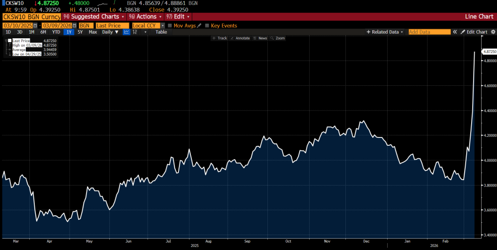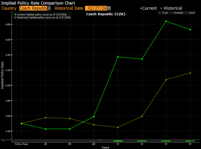 Trh od zahájení úderu na Írán výrazně přehodnotil své sázky na další vývoj kúrokových sazeb České národní banky (což jsou sazby krátkodobé – základní sazba ČNB je dvoutýdenní, na rozdíl od výše zmíněných výnosů desetiletých dluhopisů nebo sazeb desetiletých swapů). Základní sazba by podle něj měla v ročním horizontu vystoupat z nynějších 3,5 % na 4,25 %, nebo dokonce 4,5 % (viz graf: zelená křivka). Trh tedy nyní míní, že ČNB bude muset takovýmto zvýšením sazeb krotit zvýšené inflační tlaky, vyvolané zejména růstem cen zemního plynu a ropy, jejichž je Česko čistým dovozcem. Těsně před zahájením úderu na Írán trh čekal letošní stabilitu úrokových sazeb ČNB, s tou základní setrvávající na úrovni 3,5 % (viz graf: žlutá křivka).