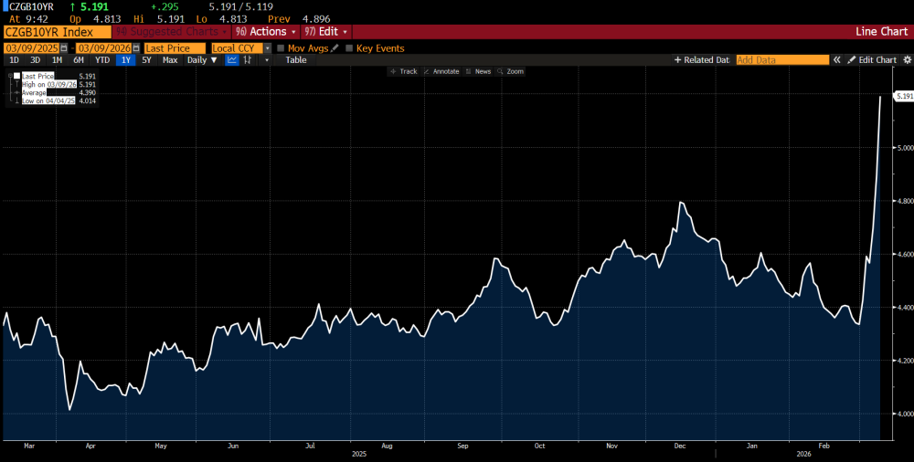 Zapomeňme na levnější hypotéky. Bankám v Česku nyní prudce narůstá cena zdrojů k jejich krytí (viz horní graf Bloombergu níže). Když byla cena zdrojů bank naposledy tak vysoká jako dnes, činila průměrná sazba hypoték dle Swiss Life Hypoindexu zhruba 6,3 % (dnes činí 4,9 %). Tyto desetileté korunové swapy úrokových měr nyní vykazují nejvyšší sazbu za více než tři roky. Dramaticky narůstají ruku v ruce s růstem dalších dlouhodobých sazeb v ČR, jako jsou výnosy desetiletých vládních dluhopisů (viz spodní graf Bloombergu níže), které dnes rovněž pokořily více než tříleté maximum – a dosáhly úrovně takřka 5,3 %. Sazby na českém dluhu i na swapech bank narůstají proto, že se investoři kvůli válce v Perském zálivu obávají citelně vyšší inflace, takže žádají právě vyšší úrok, který by jim ji dostatečně pokryl.
