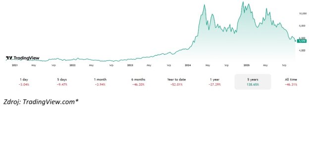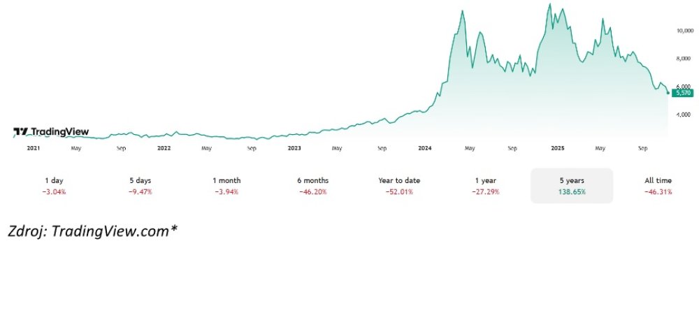 Rok 2024 byl pro kakao rekordní, když už v dubnu překonala cena průběžných kontraktů (CC1) psychologickou hranici 10 000 USD. Poté však následovalo několik měsíců korekce, aby se následně cena v prosinci vyšplhala ještě výše, na dosud nejvyšší úroveň téměř 12 000 USD, a přibližně na stejné hodnotě vstoupila komodita i do aktuálního roku. Zlom nastal v polovině května, od kdy je kakao v korekci na aktuální úroveň 5 581 USD (údaj k 13. listopadu 2025). Při pohledu na procentuální vývoj znamená tento momentální pokles za poslední rok ztrátu 27,43 %, zatímco za posledních pět let je cena „v zeleném“ s nárůstem o více než 138 %. *